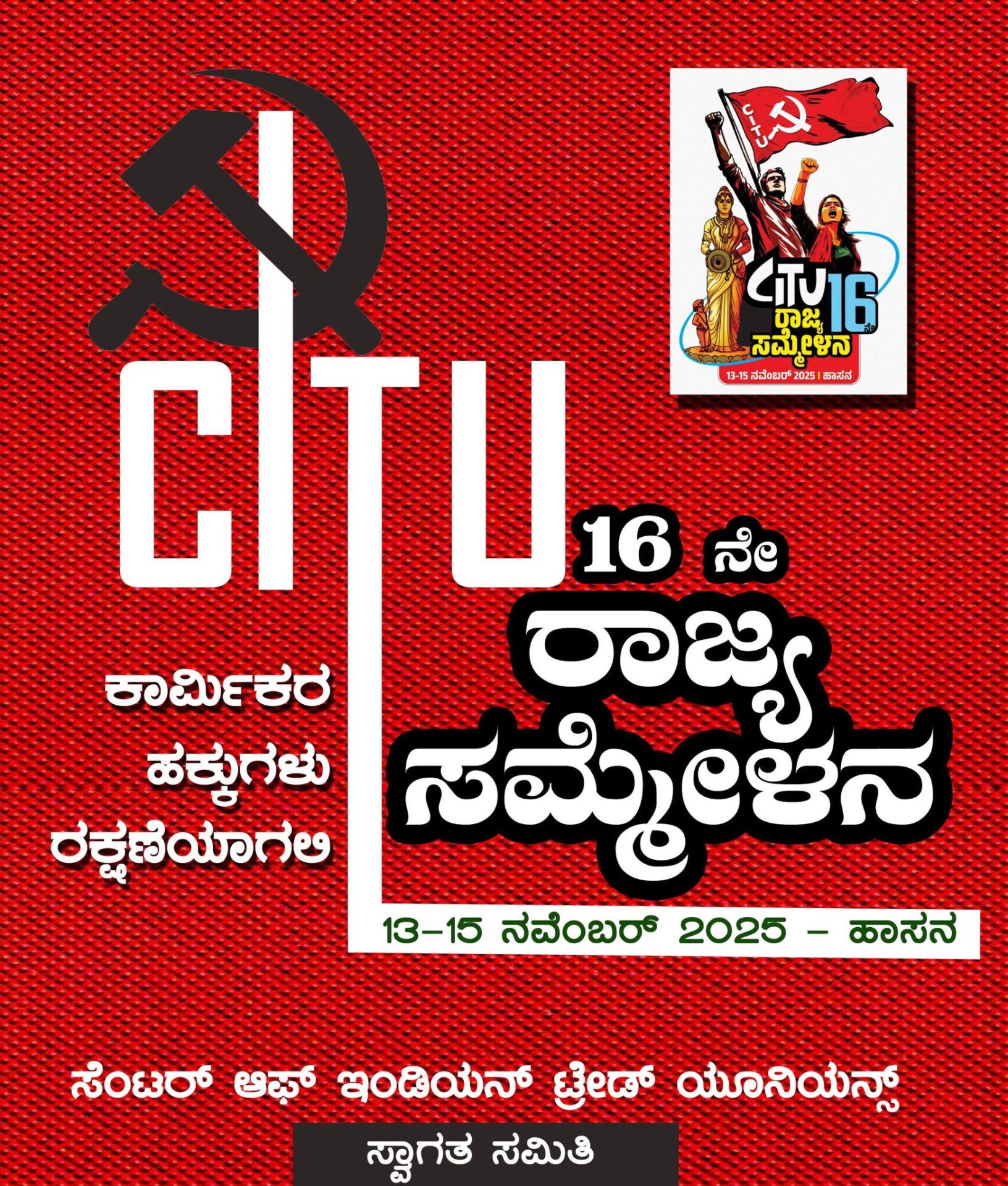 ಹಾಸನ: ಭಾರತದ ದುಡಿಯುವ ಜನರ ಮುಂಚೂಣಿ ಸಂಘಟನೆಯಾದ ‘ಸೆಂಟರ್ ಆಫ಼್ ಇಂಡಿಯನ್ ಟ್ರೇಡ್ ಯೂನಿಯನ್ಸ್ (ಸಿಐಟಿಯು)’ಕರ್ನಾಟಕ 16ನೇ ರಾಜ್ಯ ಸಮ್ಮೇಳನವು 2025ರ ನವೆಂಬರ್ ತಿಂಗಳ ದಿನಾಂಕ 13, 14 ಮತ್ತು 15 ರಂದು ಹಾಸನದ ಡಾ. ಬಿ.ಆರ್. ಅಂಬೇಡ್ಕರ್ ಭವನದಲ್ಲಿ ನಡೆಯಲಿದೆ.