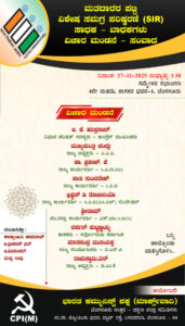 ಬೆಂಗಳೂರು: ದೇಶದಲ್ಲಿ ಕೇಂದ್ರದ ಮೋದಿ ಸರ್ಕಾರ ರಾಜಕೀಯ ಉದ್ದೇಶಕ್ಕಾಗಿ ಚುನಾವಣಾ ಆಯೋಗವನ್ನು ತನ್ನ ಕೈಗೊಂಬೆಯಾಗಿಸಿಕೊಂಡು ಮತದಾರರ ವಿಶೇಷ ತೀವ್ರ ಪರಿಷ್ಕರಣೆ (ಎಸ್.ಐ.ಆರ್) ಯನ್ನು ಜಾರಿ ಮಾಡುತ್ತಿರುವ ನಿಟ್ಟಿನಲ್ಲಿ ಎಸ್.ಐ.ಆರ್ ನ್ನು ವಿರೋಧಿಸುವ ಸಮಾನ ಮನಸ್ಕ ಎಡ ಮತ್ತು ಪ್ರಜಾಸತ್ತಾತ್ಮಕ ಪಕ್ಷಗಳನ್ನು ಒಳಗೊಂಡು ಎಸ್.ಐ.ಆರ್. ನ ಸಾಧಕ-ಬಾಧಕಗಳ ಕುರಿತು ವಿಚಾರ ಮಂಡನೆ-ಸಂವಾದ ಕಾರ್ಯಕ್ರಮವನ್ನು ಸಿಪಿಐ(ಎಂ) ಆಯೋಜಿಸುತ್ತಿದೆ.