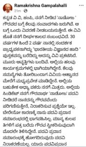 ಈ ಕುರಿತು ಅವರು ಫೇಸ್ಬುಕ್ ಪೋಸ್ಟ್ ನಲ್ಲಿ ಅಭಿಪ್ರಾಯ ಹಂಚಿಕೊಂಡಿದ್ದು, ಅದರ ಪೂರ್ಣ ಪಠ್ಯ ಈ ಕೆಳಗಿನಂತಿದೆ.