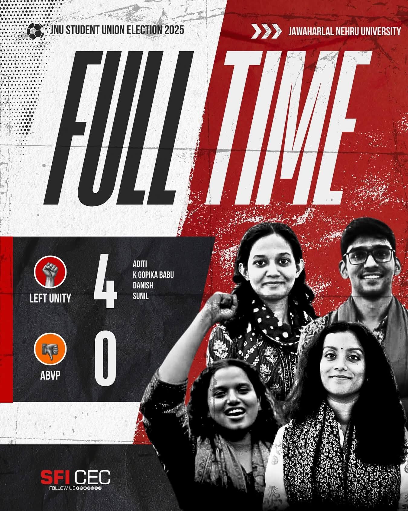 ಜವಾಹರಲಾಲ್ ನೆಹರು ವಿಶ್ವವಿದ್ಯಾಲಯದ ವಿದ್ಯಾರ್ಥಿ ಒಕ್ಕೂಟದ (ಜೆಎನ್ಯುಎಸ್ಯು) 2025 ರ ಚುನಾವಣೆಯಲ್ಲಿ ಎಡವಿದ್ಯಾರ್ಥಿ ಒಕ್ಕೂಟ ಭರ್ಜರಿ ಜಯ ಸಾಧಿಸಿದ್ದು, ನಾಲ್ಕೂ ಪ್ರಧಾನ ಸ್ಥಾನಗಳನ್ನು ಗೆದ್ದಿವೆ. ಅಧ್ಯಕ್ಷರಾಗಿ ಅದಿತಿ ಮಿಶ್ರಾ ವಿಜಯಶಾಲಿಯಾದರೆ, ಕೆ. ಗೋಪಿಕಾ ಉಪಾಧ್ಯಕ್ಷ ಹುದ್ದೆಯನ್ನು ಪಡೆದುಕೊಂಡರು. ನಿಕಟ ಸ್ಪರ್ಧೆಯ ನಂತರ ಸುನಿಲ್ ಯಾದವ್ ಪ್ರಧಾನ ಕಾರ್ಯದರ್ಶಿ ವಿಭಾಗದಲ್ಲಿ ಜಯಗಳಿಸಿದರು ಮತ್ತು ಡ್ಯಾನಿಶ್ ಅಲಿ ಜಂಟಿ ಕಾರ್ಯದರ್ಶಿ ಹುದ್ದೆಯನ್ನು ಗೆದ್ದರು. ಈ ನಿರ್ಣಾಯಕ ಗೆಲುವಿನೊಂದಿಗೆ, ಎಡ ವಿದ್ಯಾರ್ಥಿ ಸಂಘಟನೆಗಳು ಮತ್ತೊಮ್ಮೆ ಜೆಎನ್ಯು ವಿದ್ಯಾರ್ಥಿ ರಾಜಕೀಯದಲ್ಲಿ ತಮ್ಮ ಪ್ರಾಬಲ್ಯವನ್ನು ದೃಢಪಡಿಸಿವೆ.