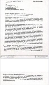 ನಿಟ್ಟೆ ವಿಶ್ವವಿದ್ಯಾಲಯವು ಸ್ವ-ಹಣಕಾಸು ಖಾಸಗಿ ಸಂಸ್ಥೆಯಾಗಿ ಆರ್ಟಿಐ ನಿಬಂಧನೆಗಳ ಅಡಿಯಲ್ಲಿ ಮಾಹಿತಿಯನ್ನು ಒದಗಿಸಲು ಬದ್ಧವಾಗಿಲ್ಲ ಎಂದು ಪುನರುಚ್ಚರಿಸಿದ 2014 ರ ಕೇಂದ್ರ ಮಾಹಿತಿ ಆಯೋಗದ ತೀರ್ಪನ್ನು ( ಸವಿನಯ, ದಕ್ಷಿಣ ಕನ್ನಡ vs. ನಿಟ್ಟೆ ವಿಶ್ವವಿದ್ಯಾಲಯ ) ಸಹ ಆಸ್ಪತ್ರೆ ಉಲ್ಲೇಖಿಸಿದೆ. ಪರಿಣಾಮವಾಗಿ, ಆಸ್ಪತ್ರೆಯು ಆರ್ಟಿಐ ವಿನಂತಿಯೊಂದಿಗೆ ಸಲ್ಲಿಸಲಾದ ಅಂಚೆ ಆದೇಶವನ್ನು ಹಿಂದಿರುಗಿಸಿತು ಮತ್ತು ಅರ್ಜಿಯನ್ನು ಔಪಚಾರಿಕವಾಗಿ ತಿರಸ್ಕರಿಸಿತು.