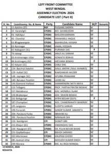 ಪಶ್ಚಿಮ ಬಂಗಾಳ: ಮುಂದಿನ ವಿಧಾನಸಭಾ ಚುನಾವಣೆಯನ್ನು ಗಮನದಲ್ಲಿಟ್ಟುಕೊಂಡು ಎಡಪಂಥೀಯ ಮೈತ್ರಿ (ಲೆಫ್ಟ್ ಫ್ರಂಟ್) ಮಾರ್ಚ್ 18ರಂದು ತನ್ನ ಎರಡನೇ ಅಭ್ಯರ್ಥಿಗಳ ಪಟ್ಟಿಯನ್ನು ಪ್ರಕಟಿಸಿದೆ.