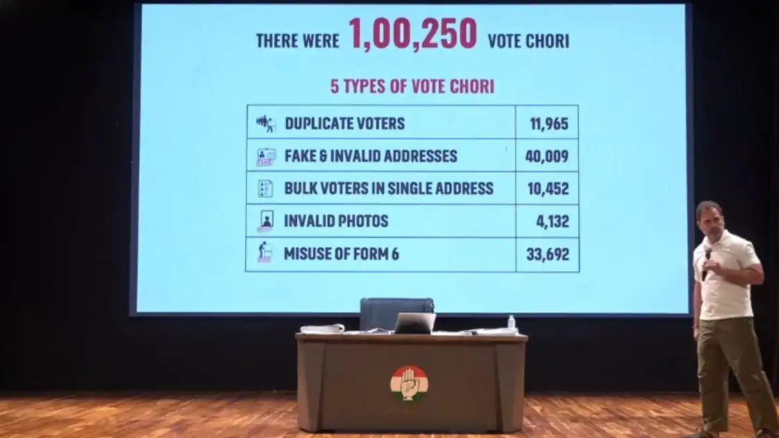 ಆಗಸ್ಟ್ 7ರಂದು ನವದೆಹಲಿಯಲ್ಲಿ ನಡೆದ ಸುದ್ದಿಗೋಷ್ಠಿಯಲ್ಲಿ, ಚುನಾವಣಾ ಆಯೋಗದ ಸಹಕಾರದೊಂದಿಗೆ ಬಿಜೆಪಿ ಐದು ರೀತಿಯಲ್ಲಿ ಮತಗಳ್ಳತನ ಮಾಡಿದೆ ಎಂದು ದಾಖಲೆಗಳೊಂದಿಗೆ ಆರೋಪಿಸಿದ್ದಾರೆ.