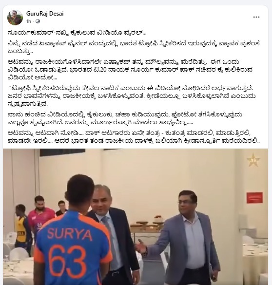 “ಕೆಲವು ದಿನಗಳ ಹಿಂದೆ ಪಾಕಿಸ್ತಾನದ ಸಚಿವರೊಂದಿಗೆ ಕೈಕುಲುಕಿ ಫೋಟೋ ತೆಗೆಸಿಕೊಂಡವರು, ಇಂದು ದೇಶಭಕ್ತಿಯ ಹೆಸರಿನಲ್ಲಿ ನಾಟಕ ಮಾಡುತ್ತಿದ್ದಾರೆ. ನಿಜವಾದ ದೇಶಭಕ್ತಿ ಇದ್ದಿದ್ದರೆ, ಪಾಕಿಸ್ತಾನದ ವಿರುದ್ಧ ಮೈದಾನಕ್ಕೇ ಇಳಿಯಬಾರದು” ಎಂದು ಅವರು ಆಕ್ಷೇಪ ವ್ಯಕ್ತಪಡಿಸಿದರು.