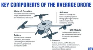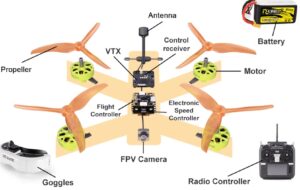 ಮೋಟರ್ ಮತ್ತು ಪ್ರೊಪೆಲ್ಲರ್ ಹೊಂದಿರುವ ರೋಟರ್; ಡ್ರೋನ್ ನ ಫ್ರೇಮ್, ಹಾರುವಾಗ ತನ್ನ ಎತ್ತರ, ವೇಗ, ಅಡೆತಡೆಗಳನ್ನು ತಿಳಿಯಲು ಬೇಕಾದ ಕ್ಯಾಮೆರಾ, ಗೈರೋಸ್ಕೋಪ್, ಎಕ್ಸೆರೆಲೊಮೀಟರ್, ಇತ್ಯಾದಿ ‘ಜ್ಞಾನೇಂದ್ರಿಯ’ ಗಳು (ಸೆನ್ಸರ್ಸ್); ತನ್ನ ಸ್ಥಾನ ತಿಳಿಯಲು ಬೇಕಾದ ಜಿ.ಪಿಎಸ್ ನಂತಹವು: ಬ್ಯಾಟರಿ, ನೆಲದಲ್ಲಿರುವ ನಿಯಂತ್ರಕದೊಂದಿಗೆ ರೇಡಿಯೊ/ರಾಡಾರ್ ಸಂಪರ್ಕ, ಬ್ಯಾಟರಿ – ಡ್ರೋನ್ ನ ಮುಖ್ಯ ಭಾಗಗಳು. ಇವಲ್ಲದೆ ಡ್ರೋನ್ ಹಾರುವಾಗ ‘ಪೈಲಟ್’ ನ ಪಾತ್ರ ವಹಿಸುವ ಇಲೆಕ್ಟ್ರಾನಿಕ್ ನಿಯಂತ್ರಕ ವೂ ಇರುತ್ತದೆ.