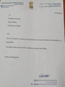 ರಾಜ್ಯಸಭಾ ಕಾರ್ಯದರ್ಶಿ ಜನರಲ್ ಅವರಿಗೆ ಬರೆದ ತಮ್ಮ ಪತ್ರದಲ್ಲಿ, ಮಾಜಿ ಸಂಸದನಾಗಿ ತಮಗೆ ದೊರೆಯುವ ಯಾವುದೇ ಹಣಕಾಸು ಪಿಂಚಣಿಯನ್ನು ಸ್ವೀಕರಿಸಲು ಇಚ್ಛಿಸುವುದಿಲ್ಲ ಎಂದು ಅವರು ಸ್ಪಷ್ಟಪಡಿಸಿದ್ದಾರೆ. ತಮ್ಮ ಈ ನಿರ್ಧಾರವನ್ನು ಸಂಸತ್ತಿನ ದಾಖಲೆಗಳಲ್ಲಿ ಅಧಿಕೃತವಾಗಿ ದಾಖಲಿಸುವಂತೆ ಕೂಡ ಮನವಿ ಮಾಡಿದ್ದಾರೆ. ಗಮನಾರ್ಹ ಅಂಶವೆಂದರೆ, ಪತ್ರದ ಕೊನೆಯಲ್ಲಿ ಅವರು ತಮ್ಮ ಸಹಿಯನ್ನು ಬೆಂಗಾಲಿ ಭಾಷೆಯಲ್ಲಿ ಮಾಡಿದ್ದಾರೆ. ಅವರ ಅವಧಿ ಏಪ್ರಿಲ್‌ 2 2026ರಂದು ಮುಗಿದಿದೆ.