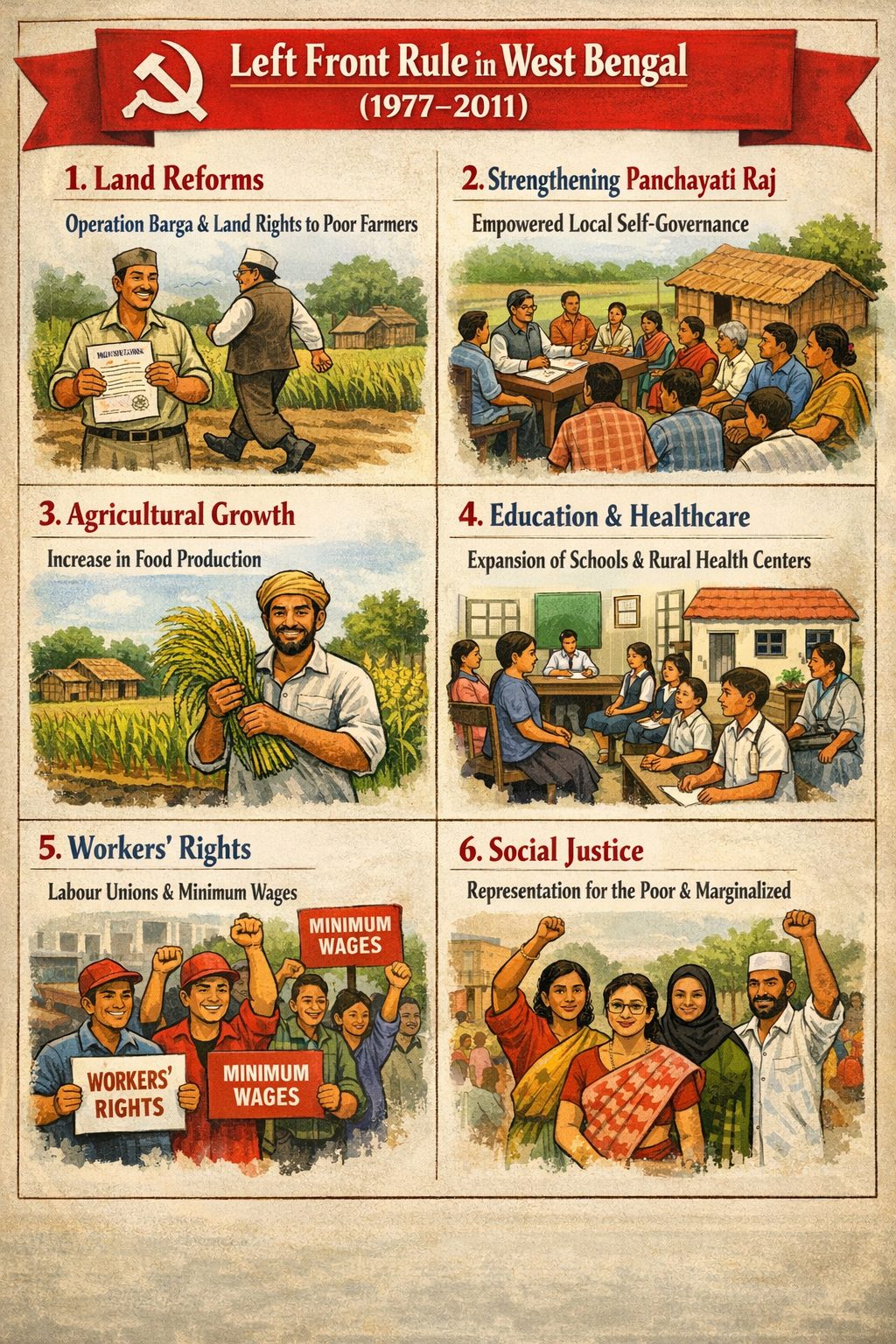 ಎಡಪಂಥದ ಪ್ರಮುಖ ಸಾಧನೆಗಳಲ್ಲಿ ಭೂಸುಧಾರಣೆ ಮತ್ತು ಪಂಚಾಯತ್ ವ್ಯವಸ್ಥೆಯ ಬಲವರ್ಧನೆ ಪ್ರಮುಖವಾಗಿದೆ. ಭೂಹೀನ ರೈತರಿಗೆ ಹಕ್ಕು ನೀಡುವುದು, ಬಾಡಿಗೆ ರೈತರನ್ನು ಕಾನೂನುಬದ್ಧವಾಗಿ ಗುರುತಿಸುವುದು ಮತ್ತು ಗ್ರಾಮೀಣ ಮಟ್ಟದಲ್ಲಿ ರಾಜಕೀಯ ಪಾಲ್ಗೊಳ್ಳುವಿಕೆಯನ್ನು ವಿಸ್ತರಿಸುವುದು, ಇವು ಗ್ರಾಮೀಣ ಸಮಾಜದಲ್ಲಿ ಸಮಾನತೆಯ ಭಾವನೆಯನ್ನು ಬಲಪಡಿಸಿತು. ಇದರ ಪರಿಣಾಮವಾಗಿ, ಬಂಗಾಳದಲ್ಲಿ “ರಾಜಕೀಯ ಜಾಗೃತಿ” ಒಂದು ವಿಶಿಷ್ಟ ಮಟ್ಟಕ್ಕೆ ಏರಿತು. ಸಾಮಾನ್ಯ ಮತದಾರನಿಗೂ ರಾಜಕೀಯದ ಬಗ್ಗೆ ಅರಿವು, ಹಕ್ಕಿನ ಭಾವನೆ ಮತ್ತು ಪ್ರತಿಕ್ರಿಯಿಸುವ ಸಾಮರ್ಥ್ಯ ಹೆಚ್ಚಾಯಿತು.
