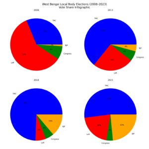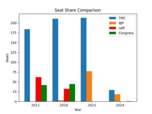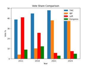 ಪಶ್ಚಿಮ ಬಂಗಾಳದ ರಾಜಕೀಯದಲ್ಲಿ ಧ್ರುವೀಕರಣವು ಕೇವಲ ರಾಜಕೀಯ ಭಾಷಣದಲ್ಲಿ ಕಾಣಿಸುವ ಅಂಶವಲ್ಲ; ಅದು ಅಂಕಿಅಂಶಗಳಲ್ಲಿ ಸ್ಪಷ್ಟವಾಗಿ ಕಾಣಿಸುವ ಸ್ಥಿರ ಪ್ರಕ್ರಿಯೆಯಾಗಿದೆ. ಕಳೆದ ನಾಲ್ಕು ಪ್ರಮುಖ ಚುನಾವಣಾ ಫಲಿತಾಂಶಗಳನ್ನು ನೋಡಿದರೆ, ಮತಗಳ ಹಂಚಿಕೆ ಮತ್ತು ಸೀಟುಗಳ ವಿನ್ಯಾಸವು ನಿಧಾನವಾಗಿ ಎರಡು ಪ್ರಮುಖ ಶಕ್ತಿಗಳ (ಟಿಎಂಸಿ ಮತ್ತು ಬಿಜೆಪಿ) ಸುತ್ತ ಸೀಮಿತವಾಗುತ್ತಿರುವುದು ಗೋಚರಿಸುತ್ತದೆ.
