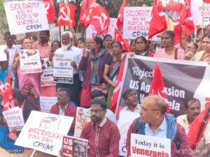 ಬೆಂಗಳೂರು: ವೆನೆಜುವೆಲಾ ವಿರುದ್ಧ ಯು.ಎಸ್. ಆಕ್ರಮಣ ಮತ್ತು ಅಧ್ಯಕ್ಷ ನಿಕೋಲಸ್ ಮಡುರೊ ಮತ್ತು ಅವರ ಪತ್ನಿ ಸಿಲಿಯಾ ಫ್ಲೋರ್ಸ್ ಅವರ ಅಪಹರಣವನ್ನು ನಾವು ಬಲವಾಗಿ ಖಂಡಿಸುತ್ತೇವೆ. ಇದು ವಿಶ್ವಸಂಸ್ಥೆಯ ಚಾರ್ಟರನ್ನು ಮತ್ತು ಹಲವು ಅಂತರರಾಷ್ಟ್ರೀಯ ಕಾನೂನು ನಿಯಮಗಳನ್ನು ಸ್ಪಷ್ಟವಾಗಿ ಉಲ್ಲಂಘಿಸುವ, ಒಂದು ಸಾರ್ವಭೌಮ ರಾಷ್ಟ್ರದ ಮೇಲೆ ನಡೆಸಿರುವ ದಾಳಿ ಎಂದು ಆರೋಪಿಸಿ ಎಡಪಕ್ಷಗಳು ಪ್ರತಿಭಟನೆ ನಡೆಸಿದವು.