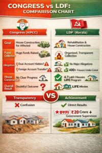 ಇದರ ವಿರುದ್ಧವಾಗಿ, ಎಲ್ಡಿಎಫ್ ಸರ್ಕಾರ ವಯನಾಡು ದುರಂತದ ಪೀಡಿತರಿಗೆ ನೇರವಾಗಿ ಮನೆ ನಿರ್ಮಾಣ ಮತ್ತು ಪುನರ್ವಸತಿ ಕಾರ್ಯಗಳನ್ನು ಕೈಗೊಂಡಿದೆ. ಈಗಾಗಲೇ ಮೊದಲ ಹಂತದಲ್ಲಿ 178 ಮನೆಗಳನ್ನು ಪೀಡಿತರಿಗೆ ಹಸ್ತಾಂತರಿಸಲಾಗಿದೆ ಮತ್ತು 400ಕ್ಕೂ ಹೆಚ್ಚು ಮನೆಗಳು ನಿರ್ಮಾಣ ಹಂತದಲ್ಲಿವೆ. ಡಿವೈಎಫ್ಐ ಸಂಘಟನೆ ಶ್ರಮದಾನ ಮತ್ತು ಜನಸಹಭಾಗಿತ್ವದ ಮೂಲಕ ₹20 ಕೋಟಿ ಸಂಗ್ರಹಿಸಿ, ಅದನ್ನು ಸಂಪೂರ್ಣವಾಗಿ ಮುಖ್ಯಮಂತ್ರಿ ಪರಿಹಾರ ನಿಧಿಗೆ ಸಲ್ಲಿಸಿರುವುದು ಪಾರದರ್ಶಕತೆಗೆ ಉದಾಹರಣೆಯಾಗಿದೆ.
