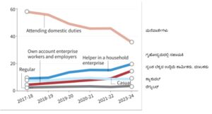 ಗ್ರಾಮೀಣ ಪ್ರದೇಶಗಳಲ್ಲಿ 15 ವರ್ಷ ವಯಸ್ಸಿಗೆ ಮೇಲ್ಪಟ್ಟ ಕೌಟುಂಬಿಕ ಕರ್ತವ್ಯ ನಿರ್ವಹಿಸುವವರ ಪ್ರಮಾಣ ಶೇ 57.8 ರಿಂದ (2017-18) ಶೇ 35.7 ಕ್ಕೆ (2023-24) ಕುಸಿದಿದೆ. ಇದು 20ಅಂಶಗಳ ಕುಸಿತ. ಈ 20 ಅಂಶಗಳಲ್ಲಿ 10 ರಷ್ಟು ಅಂಶಗಳುಕೌಟುಂಬಿಕ ಉದ್ಯಮಗಳಲ್ಲಿ ಸಹಾಯಕಿ ಎಂಬ ವರ್ಗಕ್ಕೆ ಸೇರಿದರೆ ಇನ್ನೊಂದು ಶೇ 10 ರಷ್ಟು ಸ್ವ-ಉದ್ಯೋಗ ಮತ್ತು ಮಾಲಕತ್ವ ಎಂಬ ಗುಂಪಿಗೆ ಸೇರಿದ್ದಾರೆ. ಕೋಷ್ಟಕ 6 ನೋಡಿ. ಅಂದರೆ ವೇತನರಹಿತ ಕೌಟುಂಬಿಕ ಕೆಲಸ ಎಂಬುದು ಸ್ವ-ಉದ್ಯೋಗ ಎಂಬ ಗುಂಪಿಗೆ ಸೇರಿಕೊಂಡಿದೆ. ಇದು ವೇತನ ತರುವ ಕೆಲಸವಲ್ಲ ಎಂಬುದು ಗಮನಾರ್ಹ! ಹೀಗೆ ‘ಮಹಿಳೆಯರಕೆಲಸ ಆಟಕ್ಕುಂಟು ಲೆಕ್ಕಕ್ಕಿಲ್ಲ’ ಎಂಬಂತೆ!