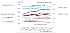 ಕಾರ್ಮಿಕರನ್ನು ಮೂರು ಪಂಗಡಗಳಲ್ಲಿ ವಿಂಗಡಿಸುವ ಪದ್ದತಿಯಿದೆ. ಸ್ವ-ಉದ್ಯೋಗಿಗಳು, ಸಂಬಳ ಕಾರ್ಮಿಕರು ಮತ್ತು ದಿನಗೂಲಿಗಳು. ಮಹಿಳಾ ಕಾರ್ಮಿಕರಿಗೂ ಇದೇ ಮಾನದಂಡಅನ್ವಯಿಸಲಾಗುತ್ತದೆ. ರಾಷ್ಟ್ರೀಯ ಸಾಂಖ್ಯಿಕ ಸಂಸ್ಥೆ ಈ ಪಂಗಡಗಳ ವರಮಾನಗಳ ಮಾಹಿತಿ ಸಂಗ್ರಹಿಸುತ್ತದೆ. ಅದರ ಪ್ರಕಾರ FLFPR ಏರಿರುವ ಸಂದರ್ಭದಲ್ಲೇ ಮಹಿಳೆಯರ ಗಳಿಕೆ (ಗ್ರಾಮೀಣ ಮತ್ತು ನಗರ ಪ್ರದೇಶಗಳಲ್ಲಿ) ಕಡಿಮೆ ಆಗಿದೆ.ಇದರ ಅರ್ಥ ಹೆಚ್ಚು ಮಹಿಳೆಯರು ಕೆಲಸಕ್ಕೆ ಸೇರುತ್ತಾರೆ. ಆದರೆ ಅವರ ಗಳಿಕೆ ಬಹಳ ಕಡಿಮೆ.ಕೋಷ್ಟಕ 5 ನೋಡಿ.  ಪ್ರಗತಿ ಆಗಲು ದುಡಿಮೆಗಾರರು ಕೃಷಿ ಕ್ಷೇತ್ರದಿಂದ ಹೊರಬಂದು ಇತರ ಚಟುವಟಿಕೆಗಳಲ್ಲಿ ತೊಡಗಬೇಕು ಎಂಬುದು ಒಂದು ಆರ್ಥಿಕ ತತ್ವ. ಗ್ರಾಮೀಣ ಪ್ರದೇಶಗಳಲ್ಲಿ ಮಹಿಳೆಯರ ಭಾಗವಹಿಸುವಿಕೆ ಹೆಚ್ಚಾಗಿದೆನಿಜ. ಆದರೆ ಅವರು ಕೃಷಿಯಿಂದ ಹೊರಬಂದಿಲ್ಲ. ಕೃಷಿ ಚಟುವಟಿಕೆಗಳಲ್ಲಿ ತೊಡಗಿರುವ ಮಹಿಳೆಯರ ಪ್ರಮಾಣ 2018-19 ರಲ್ಲಿ ಶೇ 71.1 ಇದ್ದದ್ದು 2023-24 ರಲ್ಲಿ ಶೇ 76.9 ಕ್ಕೆ ಏರಿದೆ.ಇದೇ ಸಮಯದಲ್ಲಿ ಕೃಷಿಯೇತರ ಚಟುವಟಿಕೆಗಳಲ್ಲಿ ಅವರ ಪ್ರಮಾಣ ಕುಸಿದಿದೆ.